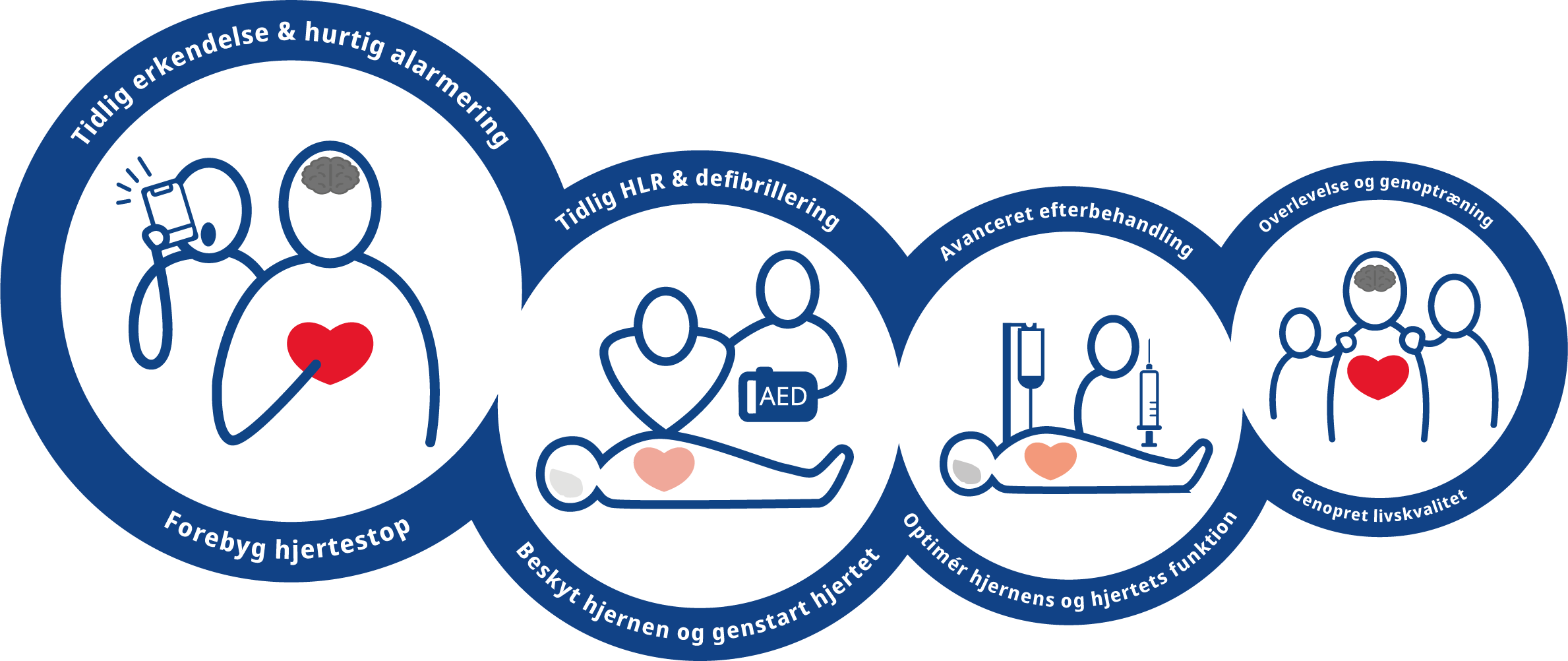 De første minutter er helt afgørende, når et menneske falder om med hjertestop, og der skal hurtigst muligt sættes gang i en kæde af reaktioner (overlevelseskæden) for at sikre vedkommende den bedste mulighed for at overleve.